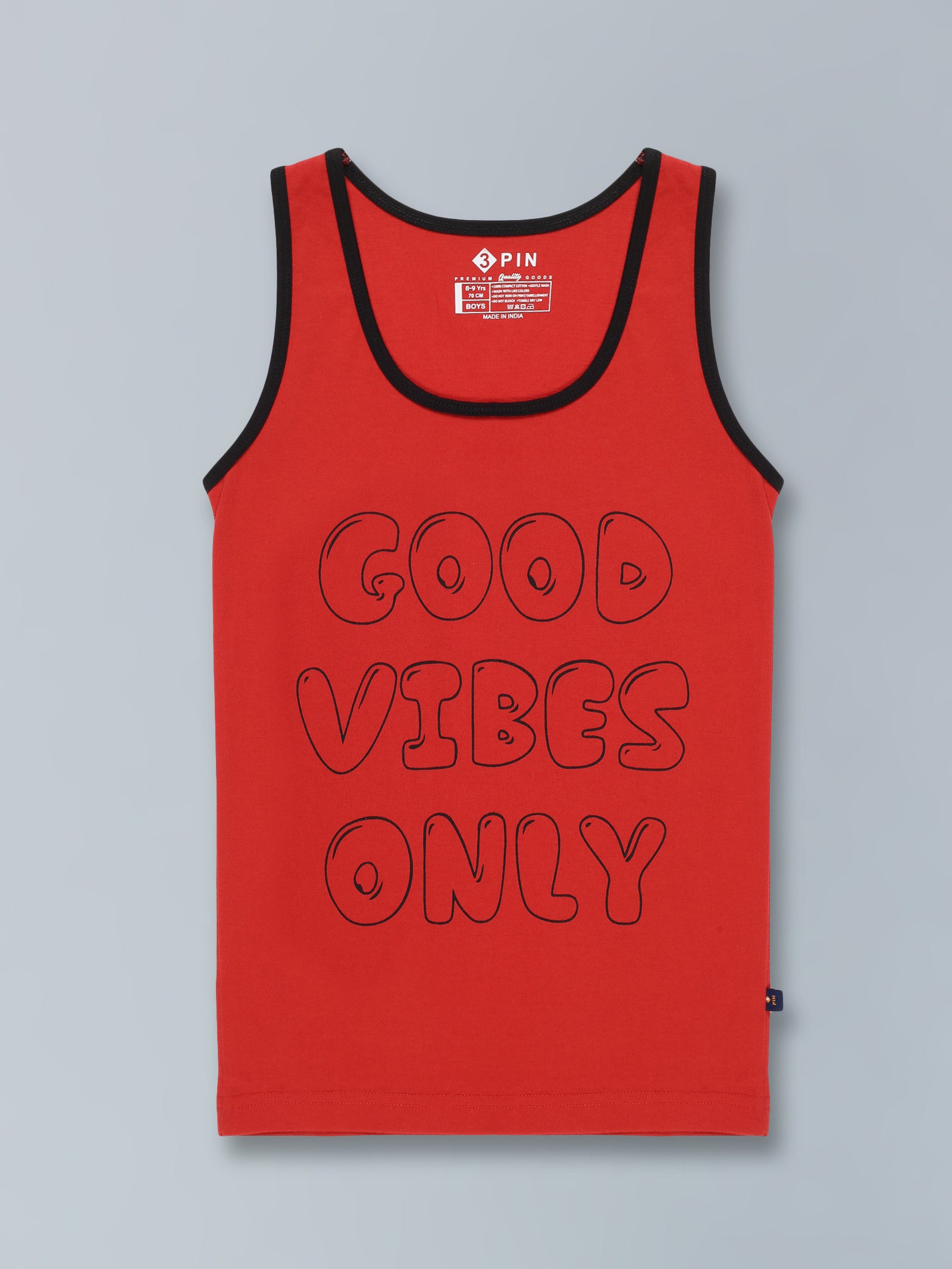 This Boys Red Good Vibes Only Typography Printed cotton Vest in RED color is a hip and fashion-forward look for any active boy. It features a bold typography print in a bright red color to ensure your little one stands out from the crowd. Crafted from a soft and comfortable cotton blend, it keeps him cool in any weather while keeping the fun and playful vibes going. With its easy-to-dress-in solid back and adjustable strap, this vest is perfect for everyday wear no matter the occasion. Get your boy the timeless look with this Good Vibes Only vest and turn any day into a fun-filled adventure.