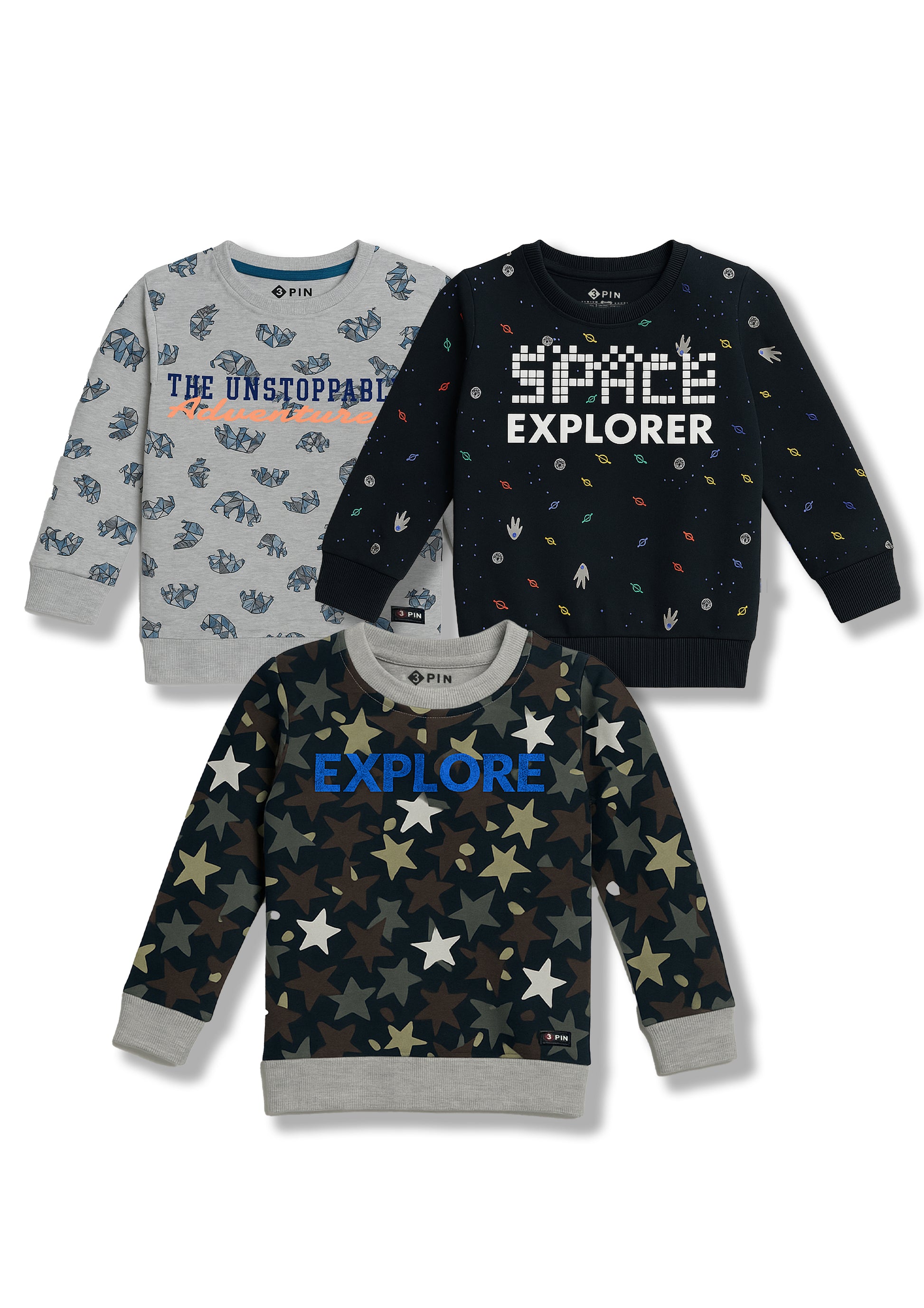 BOYS PACK OF 3 100% COTTON SWEATSHIRTS - MULTI COLOUR